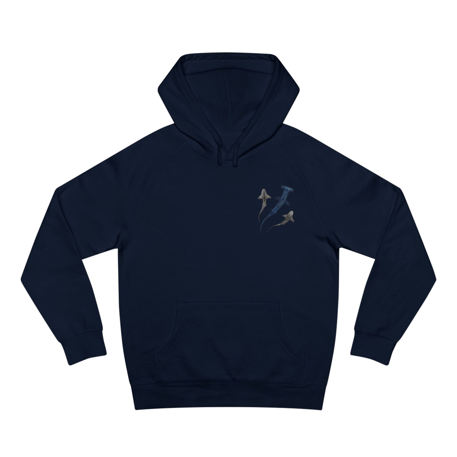 A soft, midweight hoodie that feels like a quiet, comforting tide. The front carries a small, stylized shark emblem; the back shows a gentle, mosaic-patterned hammerhead shark silhouette with the words “And when you pass through deep waters I will be WITH YOU.” This hoodie wraps you in breathable cotton-blend warmth while the roomy kangaroo pocket and adjustable hood make it an easy layer for long walks by the shore, late-night study sessions, or slow mornings at home. It reads calm and resilient — a wearable reminder of steady presence and quiet courage.